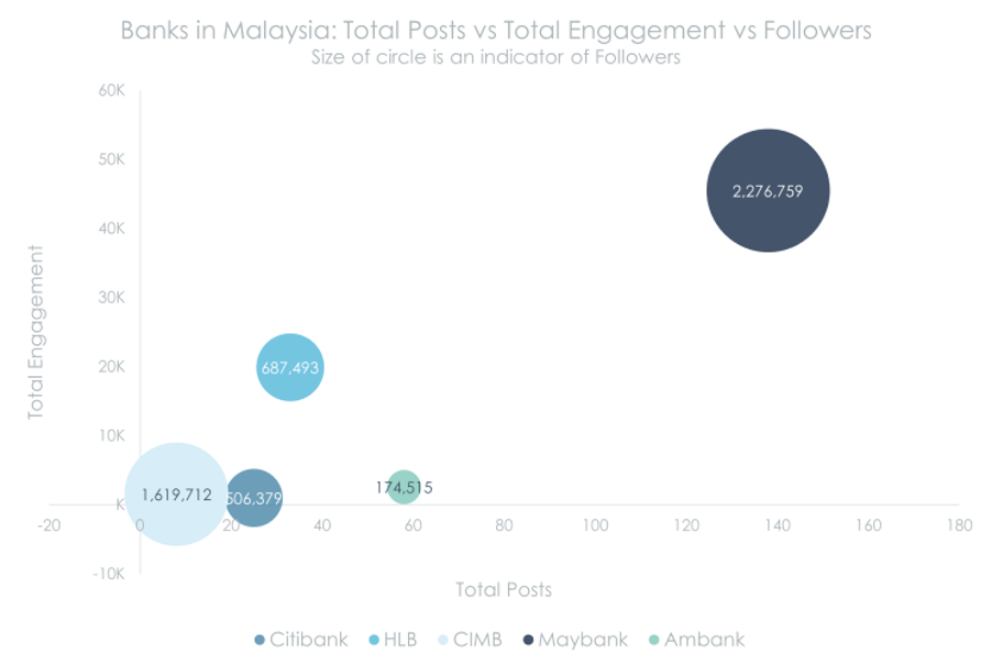 Out of the 5 banks, Maybank put the most effort on its Facebook content, achieving better results in engagement vs the rest. The correlation coefficient shows that, as publications become more frequent, engagement increases.